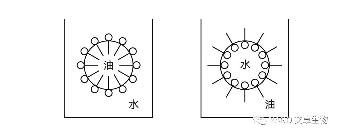 兩種互不相溶的液相,如油相和水相,以微小粒子(液滴或液晶)分散在另一相中所形成的體系稱為乳狀液,也稱為乳化體。在乳狀液中以微小粒子或液滴形式存在的那一相稱為分散相,或內相;而包圍在它外面的液體稱為分散介質,或外相、連續相。將水和油混合時,能夠形成兩種類型乳狀液。一種是油分散在水中,油是分散相,水是分散介質,形成的是水包油(O/W)型乳狀液,相反形成的是油包水(W/O)型乳狀液。