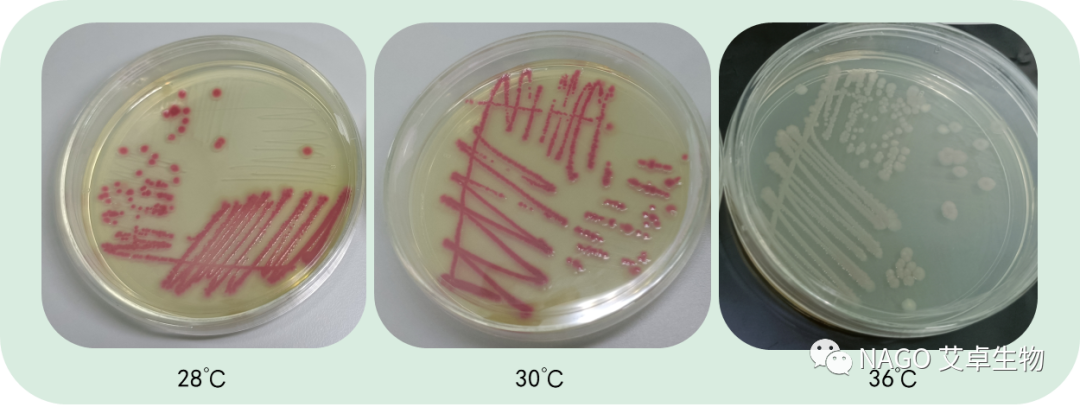 從結(jié)果來看,28℃與30℃下培養(yǎng)的沙雷氏菌顏色差別不大,都呈現(xiàn)紅色;36℃下培養(yǎng)的則呈現(xiàn)淡粉色;高于36℃基本上就不再產(chǎn)生靈菌紅素。