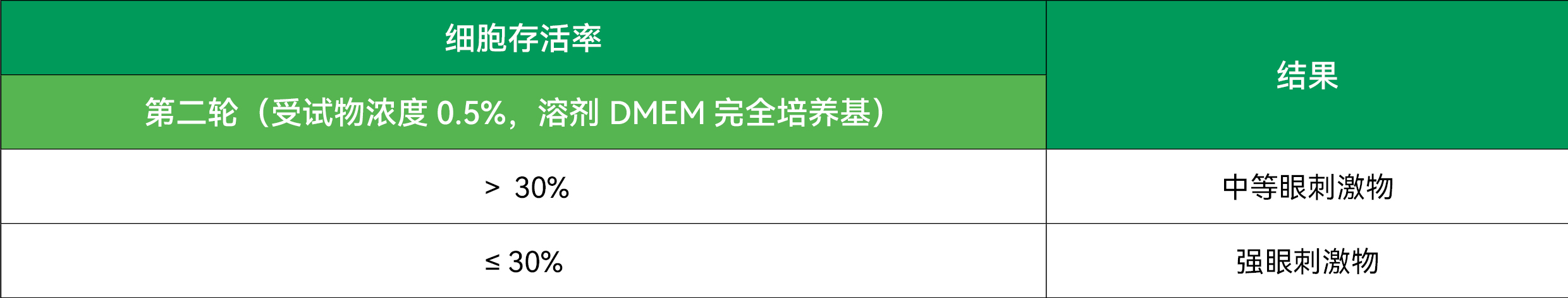 ②、根據行業(yè)標準SN/T3084.2-2014進出口化妝品眼刺激性試驗第2部分:角膜細胞試驗方法,在稀釋受試物時,統(tǒng)一稀釋到0.5%,溶劑使用PBS,作用5min后,使用MTT法或者CCK-8法測定細胞的吸光度,計算出相應的細胞存活率。當這一次實驗出現(xiàn)細胞存活率≤70%的情況,需要開始第二輪試驗,受試物濃度不變與上一次實驗相同,溶劑改用DMEM完全培養(yǎng)基,同樣方法測試,最后計算相對細胞存活率。判斷標準: