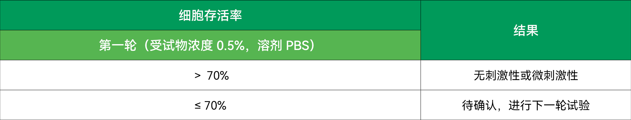在稀釋受試物時,一個受試物同時稀釋到5%和0.05%兩個濃度,溶劑為生理鹽水,作用5min后,使用MTT法或者CCK-8法測定細胞的吸光度,計算出相應的細胞存活率。判斷標準:
